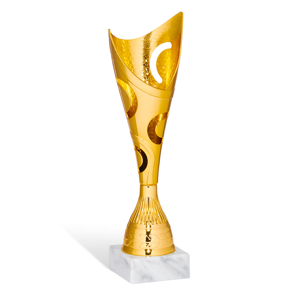 Coppa economica personalizzata per premiazioni sportive con tazza e corpo in plastica e base marmo. Tazza e corpo dorati.