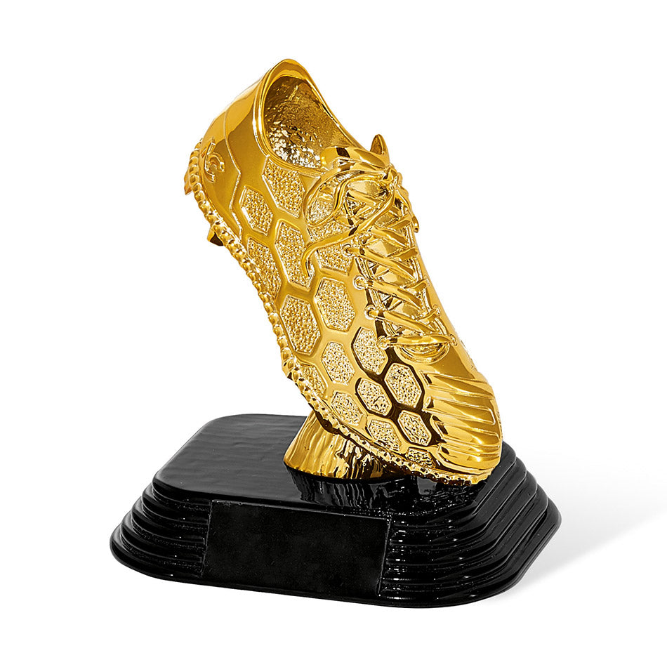 Trofeo calcio per premiazioni sportive in resina. Soggetto scarpetta da calcio in resina oro e base nera.