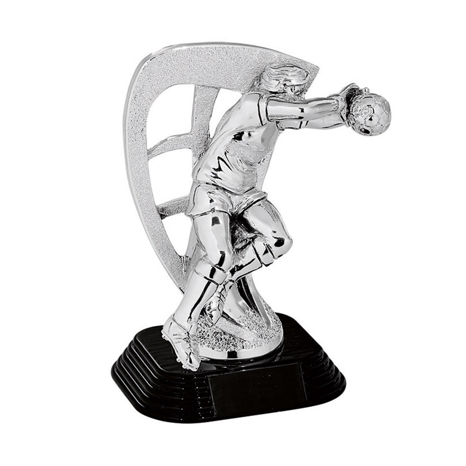 Trofeo calcio per premiazioni sportive in resina. Soggetto portiere con pallone in resina argento e base nera.