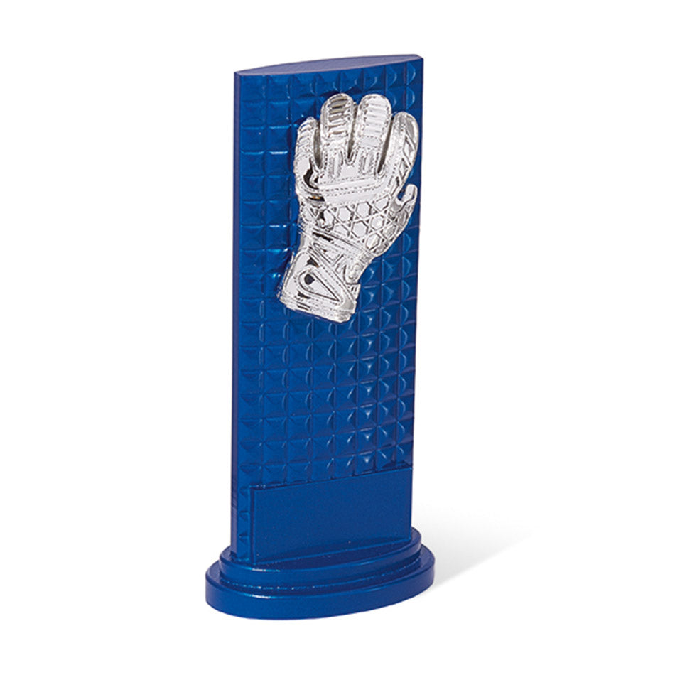 Trofeo calcio per premiazioni sportive in resina. Totem in resina blu con soggetto guanto da portiere in resina argentata.