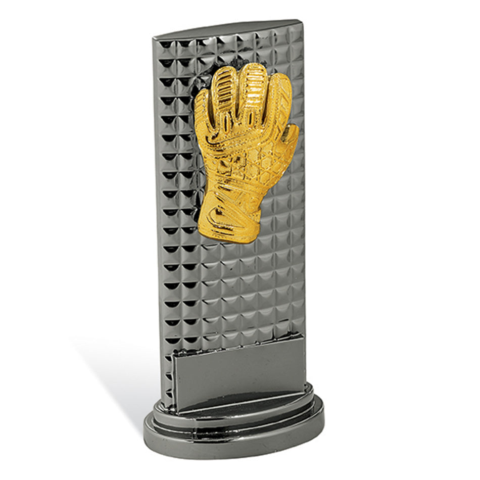 Trofeo calcio per premiazioni sportive in resina. Totem in resina grigio/smoke con soggetto guanto da portiere in resina dorata.