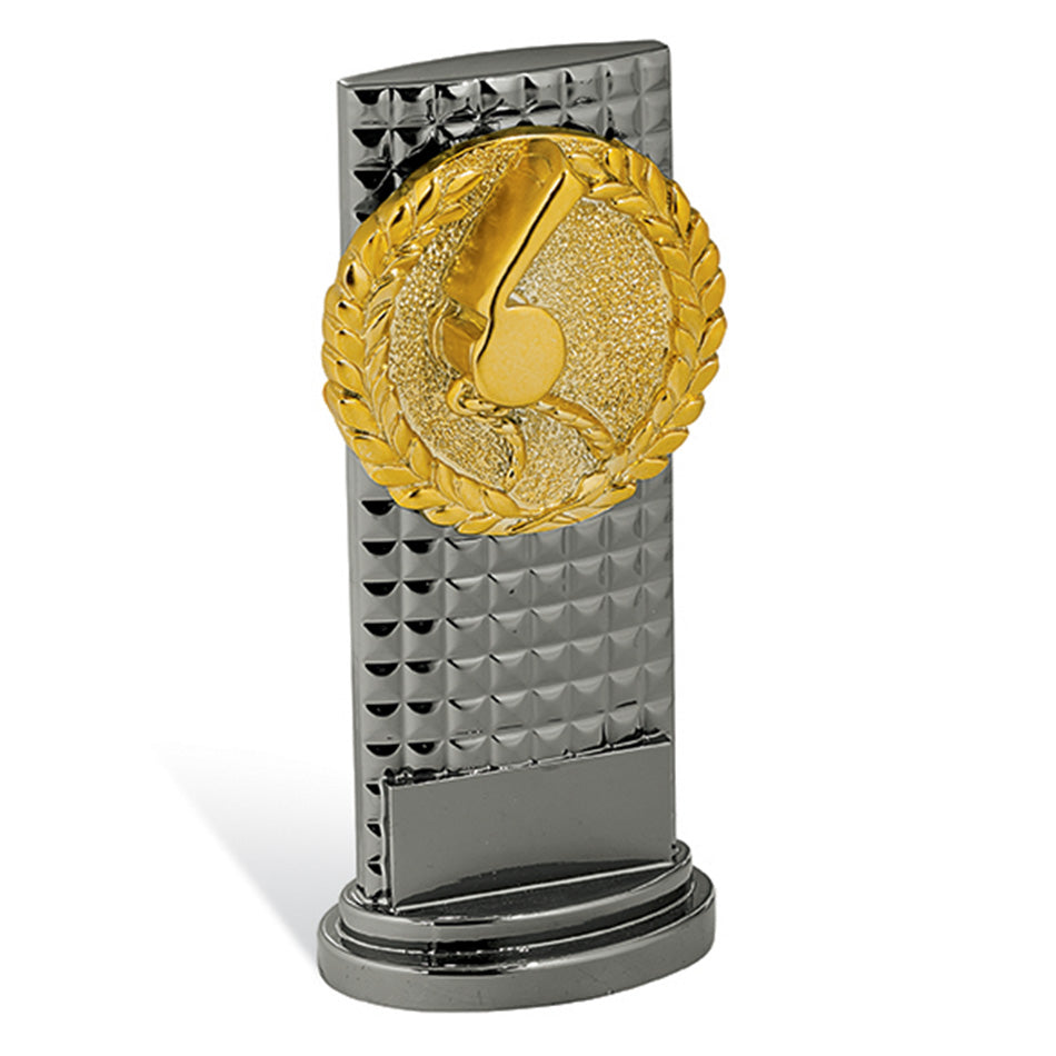 Trofeo calcio per premiazioni sportive in resina. Totem in resina grigio/smoke con soggetto fischietto da arbitro in resina dorata.