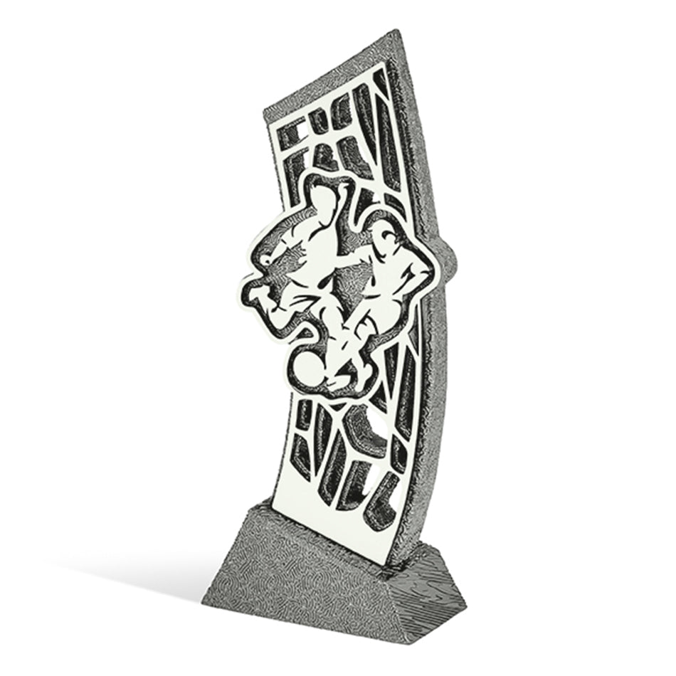 Trofeo calcio per premiazioni sportive in resina effetto grafite. Soggetto azione tra due calciatori.