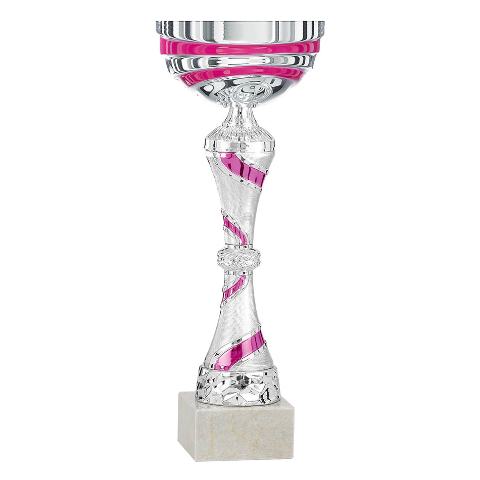 Coppa personalizzata per premiazioni sportive con tazza in metallo, corpo in plastica e base marmo. Tazza in metallo e corpo argento con dettagli fuxia/rosa.