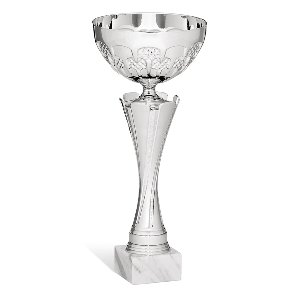 Coppa personalizzata per premiazioni sportive con tazza in metallo, corpo in ABS e base marmo. Tazza in metallo argento e corpo argento.