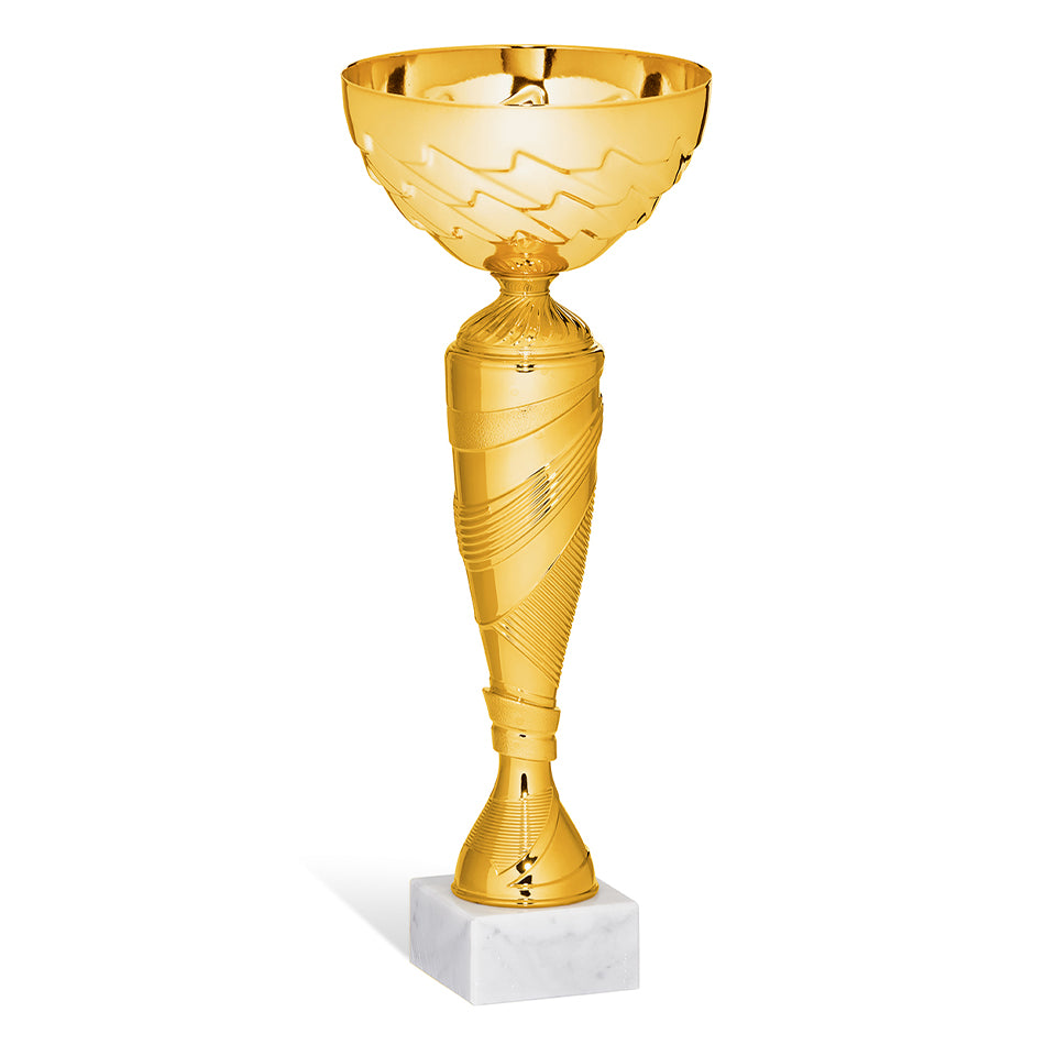 Coppa personalizzata per premiazioni sportive con tazza in metallo, corpo in ABS e base marmo. Tazza dorata e corpo dorato.
