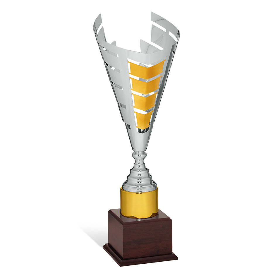 Coppa personalizzata per premiazioni sportive con tazza in metallo lavorazione laser, corpo in metallo e base in legno. Tazza e corpo argentati con dettagli oro.