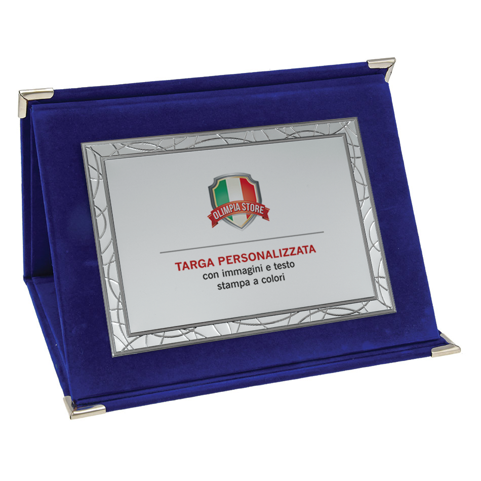 Targa per premiazione o ricorrenza, forma rettangolare, in alluminio, colore argento, personalizzata con stampa a colori, applicata su cartella rivestita in velluto blu.